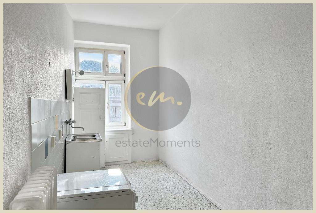 Die Wohnung selbst liegt im 4. Obergeschoss des Vorderhauses und verfügt über 2 Zimmer, eine geräumige Küche mit Platz für einen Essbereich und ein Bad mit Dusche. Die Zimmer und der Flur sind mit Dielenboden ausgestattet.