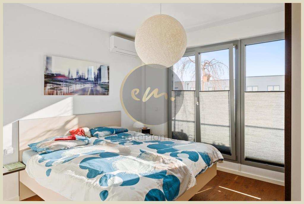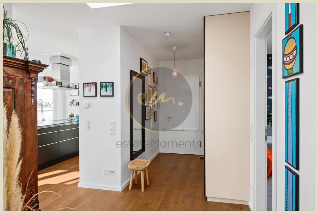 Von außen überzeugt der Neubau durch eine moderne Architektur. Die Wohnung selbst liegt im Dachgeschoss (Penthouse) und verfügt neben dem Wohnbereich mit offener Küche über zwei Schlafzimmern, die über einen großzügigen Flur begehbar sind. Im Flur bietet ein Einbauschrank Platz für die Garderobe. Der moderne und durch seine großflächige Fensterfront lichtdurchflutete Wohnbereich bietet eine behaglich Raumatmosphäre, die zugleich auch Privatsphäre bietet.