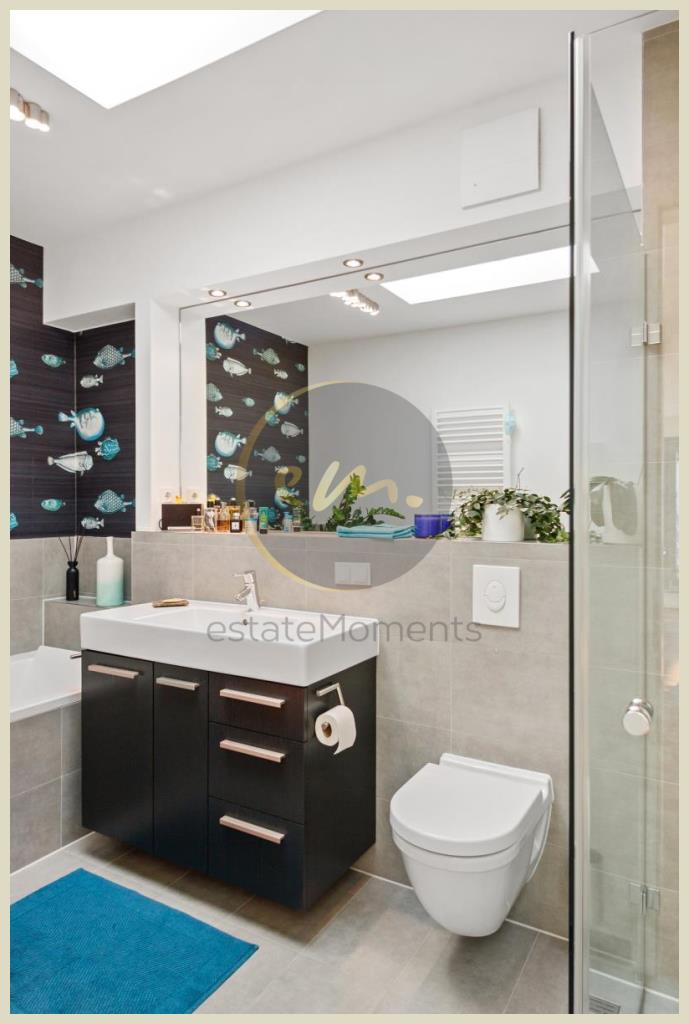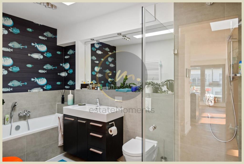 Das großzügige Hauptbad ist mit einem Waschtisch, einer Badewanne und zusätzlich mit einer bodentiefen und mit Sichtglaswänden versehenen Dusche ausgestattet. Das große elektrisch verstellbare Oberlicht im Bad sorgt auf Wunsch nicht nur für Tageslicht, sondern auch für eine natürliche Belüftung. Ein weiteres Oberlicht im Flur verleiht diesem sowie dem angeschlossenen Wohnbereich zusätzliche Helligkeit. Beide Oberlichte haben zusätzlich zum elektrischen Betrieb auch eine Verschattungsfunktion.