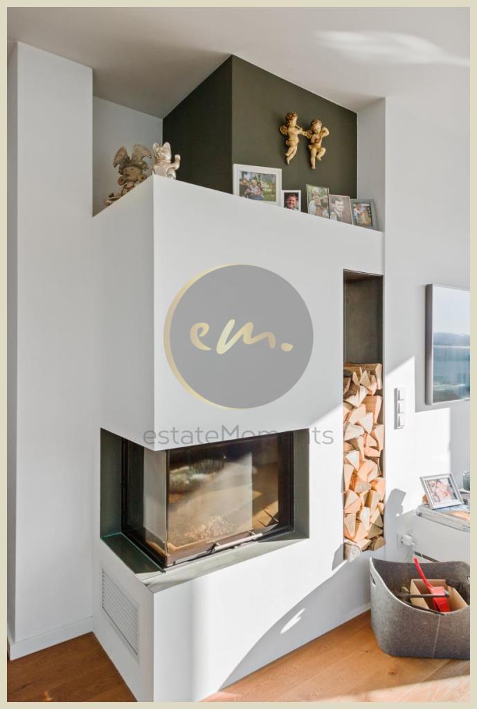 Der Wohnbereich ist mit einem Kamin und einer offenen Einbauküche mit Kochinsel ausgestattet. Die Einbauküche ist mit hochwertigen Elektrogeräten ausgestattet.