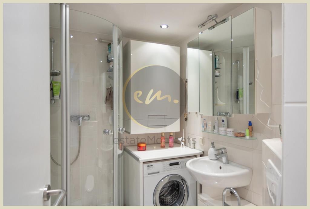 Das vorhandene Duschbad ist teilweise raumhoch gefliest und wurde mit einer Runddusche und Deckenspots ausgestattet. Im Bad befindet sich auch der Waschmaschinenanschluss.