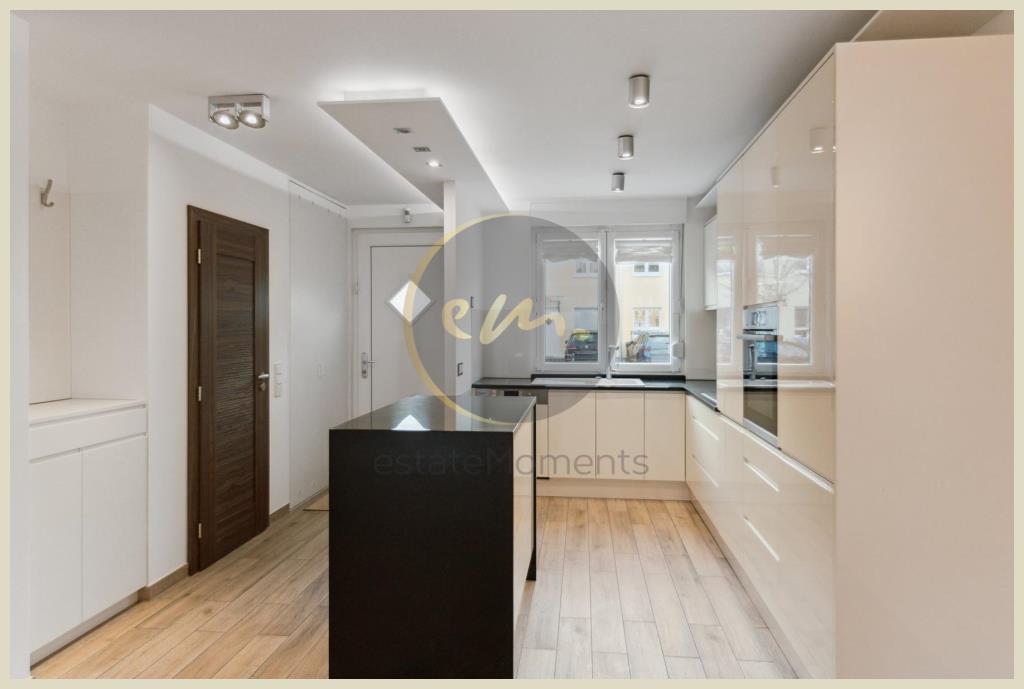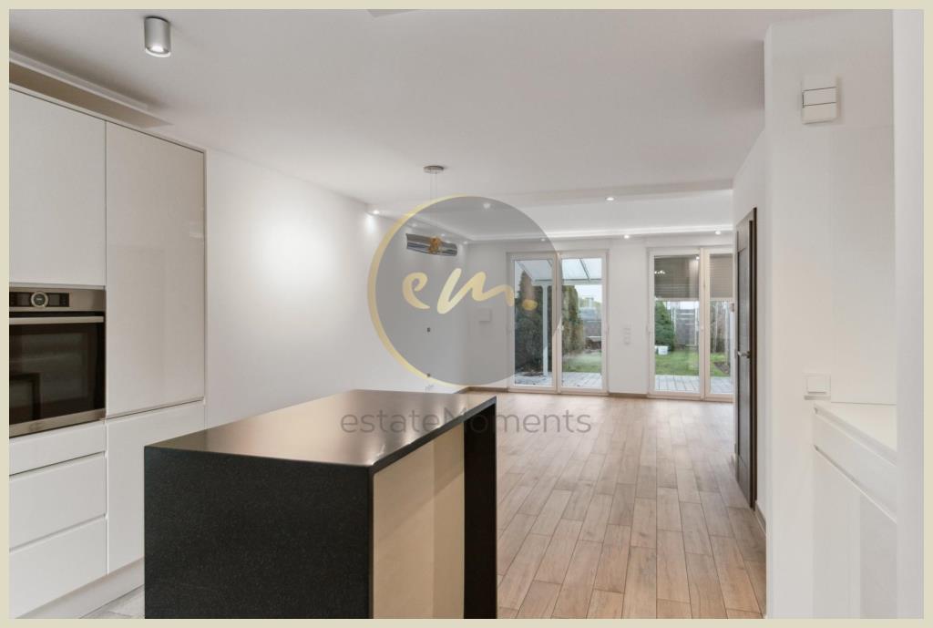 Im Erdgeschoss befinden sich ein Gäste-Bad, der offene Küchenbereich mit einer hochwertigen Einbauküche sowie das geräumige Wohn- und Esszimmer mit Zugang zur Terrasse sowie dem eigenen Garten in Nordostausrichtung. Das Obergeschoss bietet drei Schlaf- bzw. Arbeitszimmer sowie ein stilvolles Badezimmer mit Dusche und Badewanne.