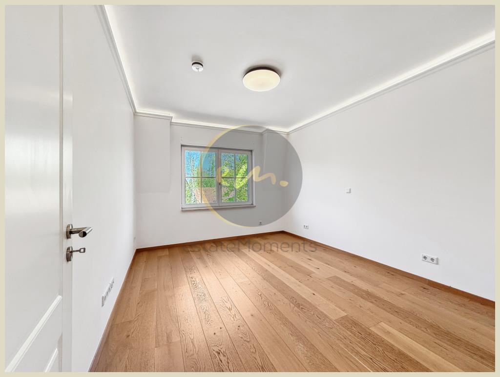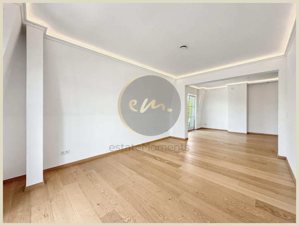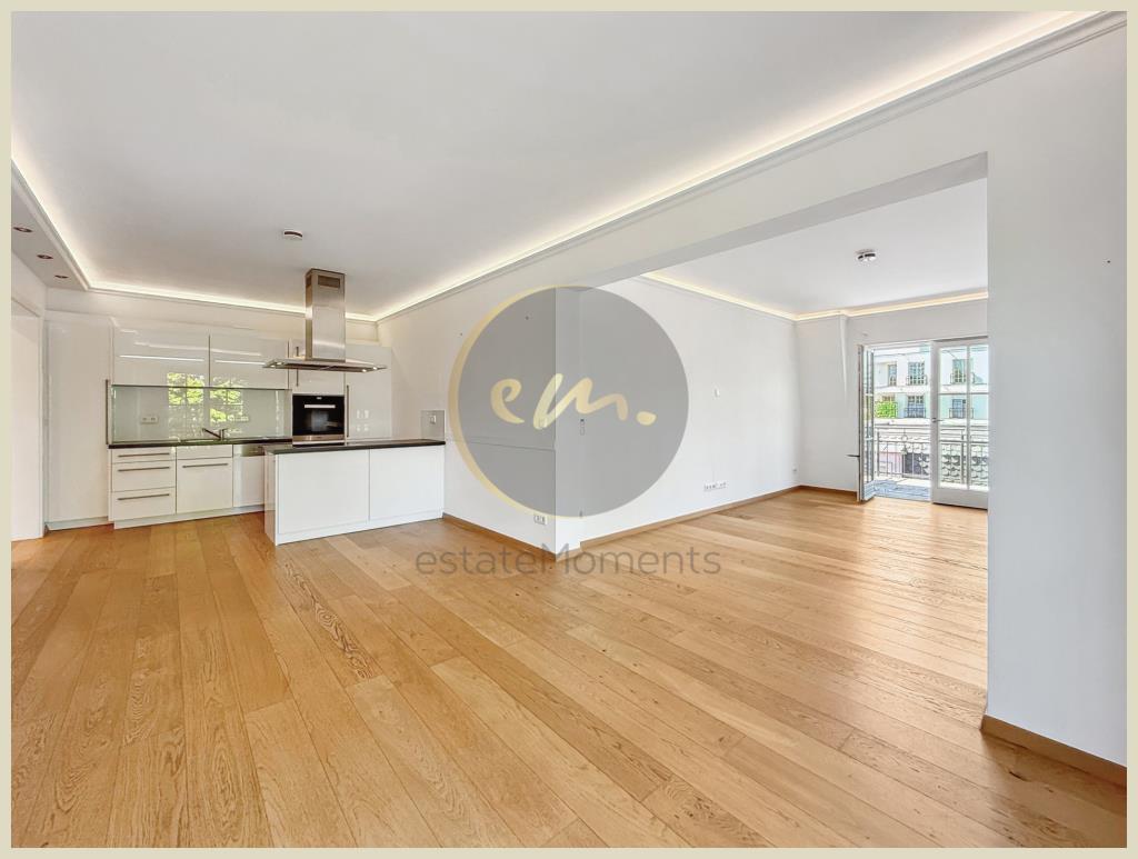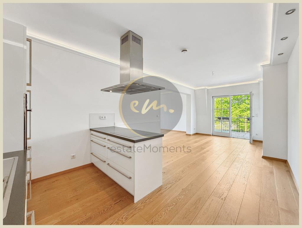 Die Wohnung ist mit hochwertigem Parkett ausgestattet, zusätzlich sorgt indirekte Deckenbeleuchtung in Wohn-, Schlaf- und Küchenbereichen für ein stimmungsvolles Ambiente. Die offene Küche ist zweckmäßig geschnitten und lässt sich perfekt in das Wohnkonzept integrieren.