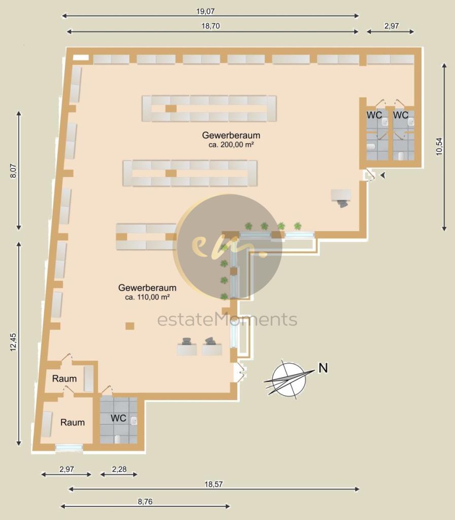 Die Gewerbeberäume bieten Raumhöhen von ca. 2,86 m (mit abgehängten Decken) bis ca. 4,20 m (ohne abgehängte Decken) und eine absolut flexible Grundrissaufteilung.