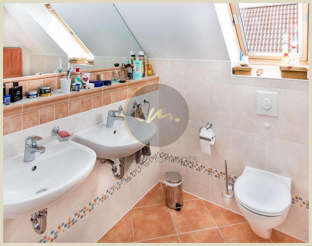 Auf ein Gäste-WC im Erdgeschoss wurde seinerzeit zu Gunsten eines großzügigen Eingangsbereichs verzichtet. Insgesamt verfügt das Haus jedoch über zwei Tageslichtbäder im Ober- und Dachgeschoss sowie ein vollausgestattetes Gästebad im Kellergeschoss.